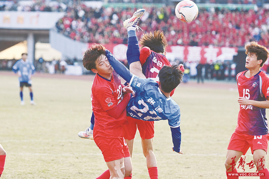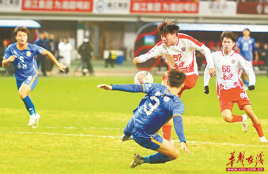 ?12月14日晚,長沙賀龍體育場,球員在比賽中激烈拼搶。當天,2025湘超聯賽淘汰賽首輪戰火燃爆!長沙隊(紅)主場迎戰岳陽隊,最終以2比0戰勝岳陽隊,與常德、永州、株洲三支球隊攜手挺進四強。本組照片為華聲在線全媒體記者郭立亮及通訊員攝