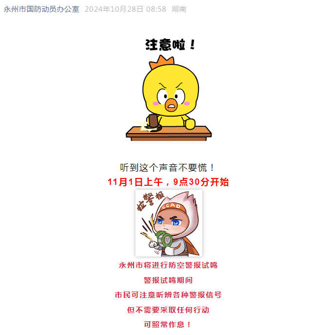 永州市國防動員辦公室關于開展防空警報試鳴活動的溫馨提醒