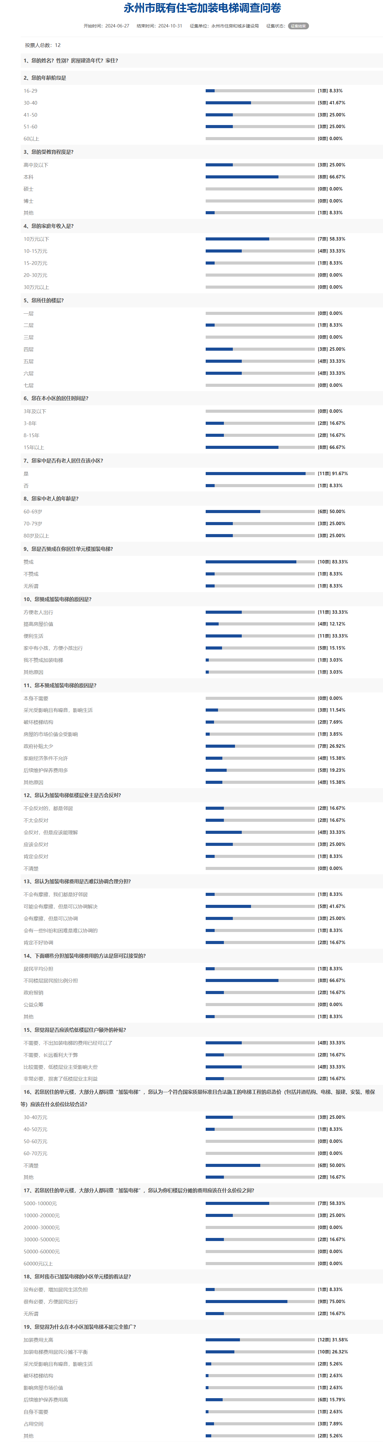 關于永州市既有住宅加裝電梯的調查問卷自2024年6月27日開始,至2024年10月31日結束,投票人數12人,具體情況見下圖統計:
