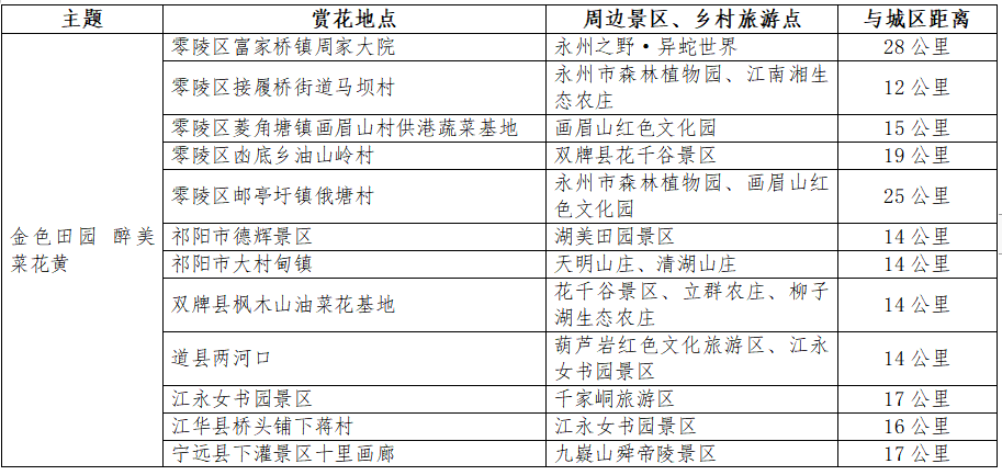 推薦賞花地點:零陵區富家橋鎮周家大院、接履橋街道馬壩村、菱角塘鎮畫眉山村供港蔬菜基地、凼底鄉油山嶺村、郵亭圩鎮俄塘村;祁陽市德輝景區、大村甸鎮;雙牌縣楓木山油菜花基地;道縣兩河口;江永女書園景區;江華縣橋頭鋪下蔣村,寧遠縣下灌景區十里畫廊。