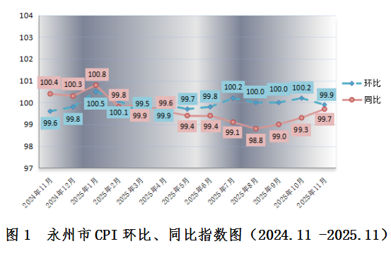 2025年11月份,食品供應總體充足,永州居民消費價格(CPI)同比價格下跌0.3%,環比價格下跌0.1%。