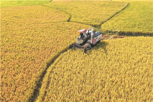 10月12日,藍山縣土市鎮(zhèn)團結(jié)村村民駕駛收割機在田間收割水稻。金秋時節(jié),該縣種植的晚稻迎來豐收,村民搶抓晴好天氣收割水稻,確保顆粒歸倉。 彭華 攝