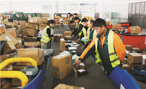 “雙十一”期間,我市各地快遞物流企業結合實際情況,通過智能系統升級、人力調配優化等措施,確保快遞物流高效運行,全力應對電商購物高峰期。圖為中國郵政集團有限公司江永縣分公司郵件處理中心,工作人員正在流水線上分揀快遞包裹。 田如瑞 攝