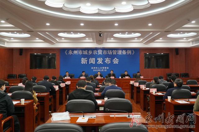 永州新聞網訊(記者 彭麗霞)3月1日上午,《永州市城鄉農貿市場管理條例》實施解讀新聞發布會召開。市人大財經委主任委員、常委會預算工委主任秦小國主持發布會,市人大法制委主任委員、常委會法工委主任楊勝貯介紹相關情況,市農業農村局黨組成員、副局長高宏華,市商務局黨組成員、副局長李燁,市市場監管局總工程師彭威,市城管執法局二級調研員張造明回答了記者提問。