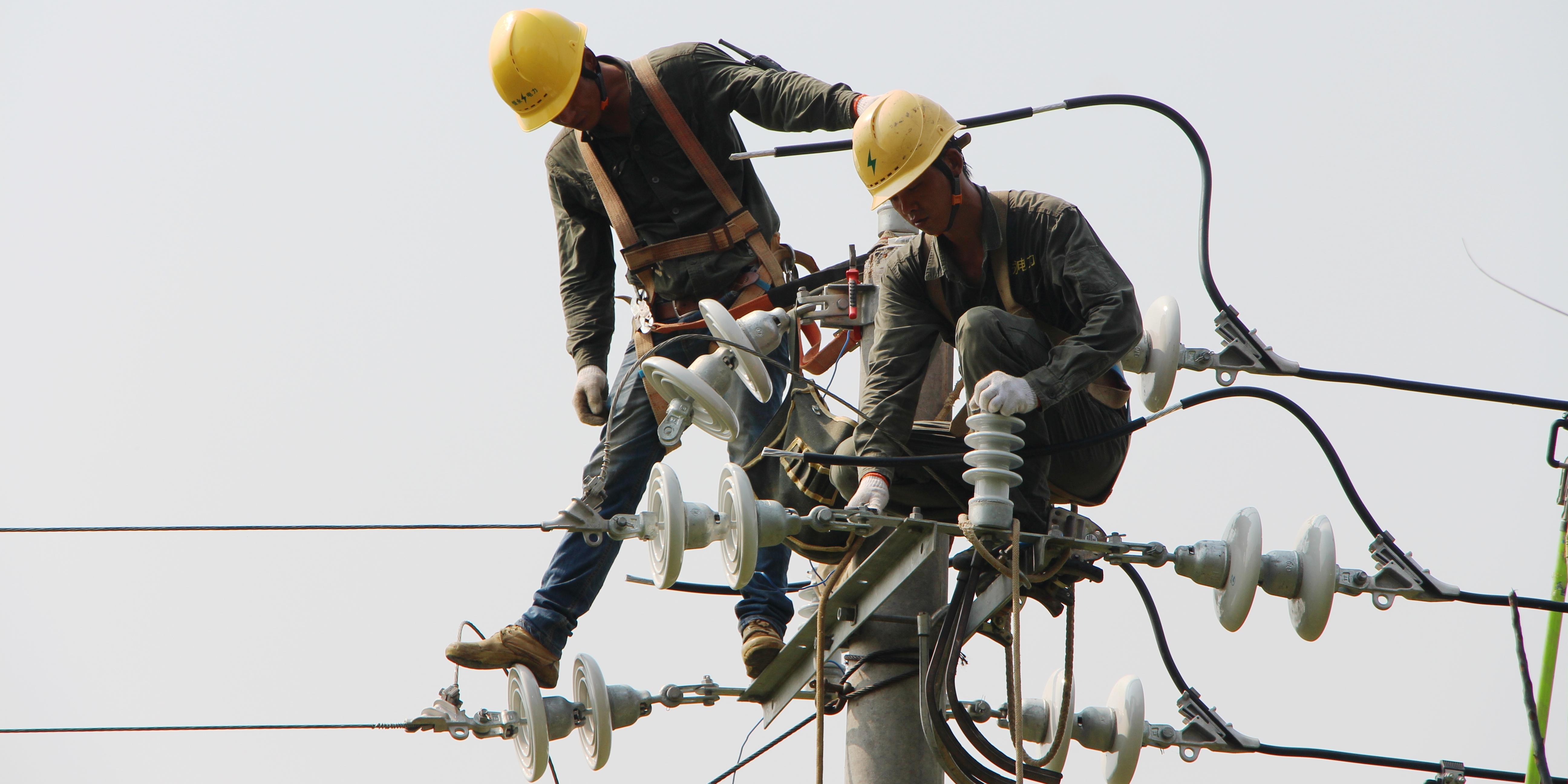 (8月28日,國網(wǎng)永州供電公司員工在江永縣瀟浦鎮(zhèn)和興村展放10千伏線路導線。)