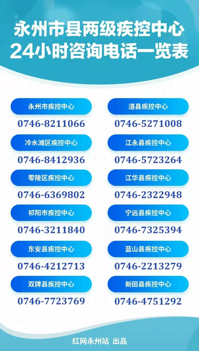 永州市縣兩級疾控中心24小時(shí)咨詢電話一覽表和各鄉(xiāng)鎮(zhèn)(街道)值班電話(截至2022年3月6日)