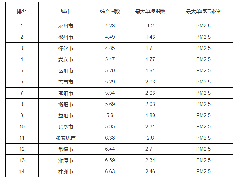 根據湖南省環境監測中心站提供的監測統計結果,按照環保部《城市環境空氣質量排名技術規定》(環辦〔2014〕64號)的要求,2016年1月,我省14個市州所在城市環境空氣質量排名情況如下: