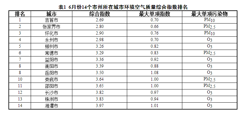 按照城市環境空氣質量綜合指數評價,6月份空氣質量相對較好的是吉首市,相對較差的是湘潭市。
