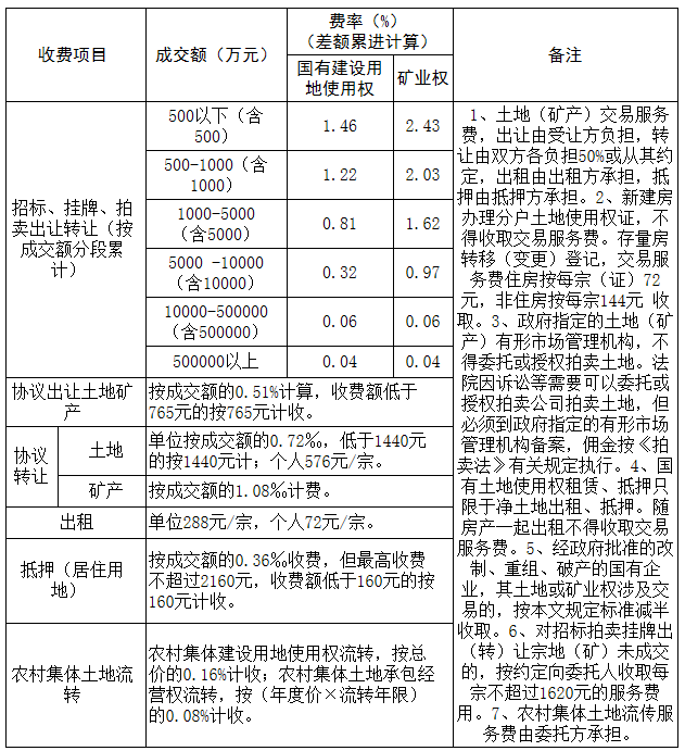 (一)為地(礦)產(chǎn)交易(包括招標(biāo)、拍賣(mài)、掛牌、協(xié)議方式轉(zhuǎn)讓)提供進(jìn)場(chǎng)或網(wǎng)上交易服務(wù)時(shí),執(zhí)行下列收費(fèi)標(biāo)準(zhǔn):