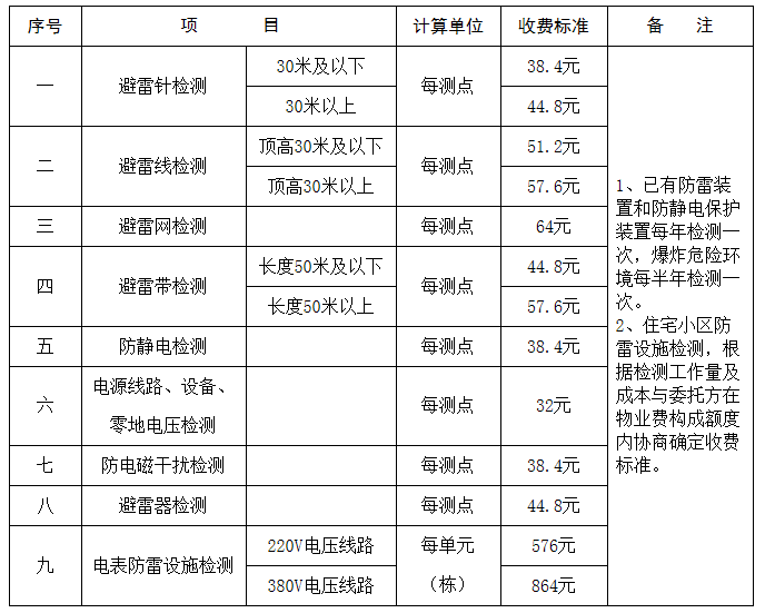 三、防雷技術(shù)服務(wù)費(fèi)降低20%后的各項(xiàng)具體收費(fèi)標(biāo)準(zhǔn)如下:
