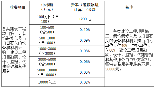 (二)為各類建設(shè)工程的勘察、設(shè)計(jì)、施工、裝飾裝修、監(jiān)理、代建管理以及與工程有關(guān)的材料設(shè)備采購(gòu)提供進(jìn)場(chǎng)或網(wǎng)上交易服務(wù)時(shí),執(zhí)行下列收費(fèi)標(biāo)準(zhǔn):