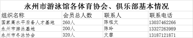 截至2018年底,永州市游泳館將為3個運動項目俱樂部(群眾體育組織)提供活動場所,會員總數達到780人(有關運動項目俱樂部、群眾體育組織名單及其聯(lián)系人、聯(lián)系方式附后)。